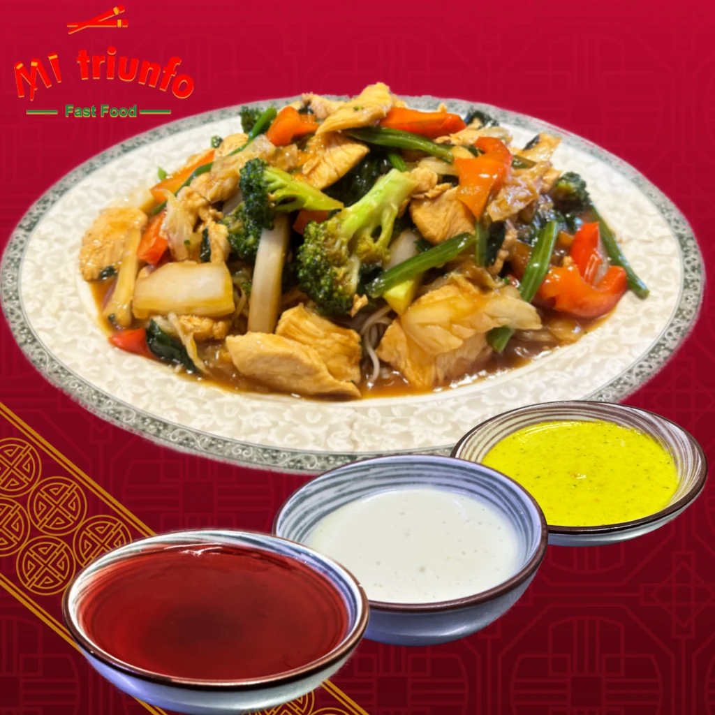 250 GRAMOS DE TALLARÍN CHINO, SALTEADO CON LAS MEJORES VERDURAS FRESCAS DE LAREGION MAS LAMINAS DE POLLO