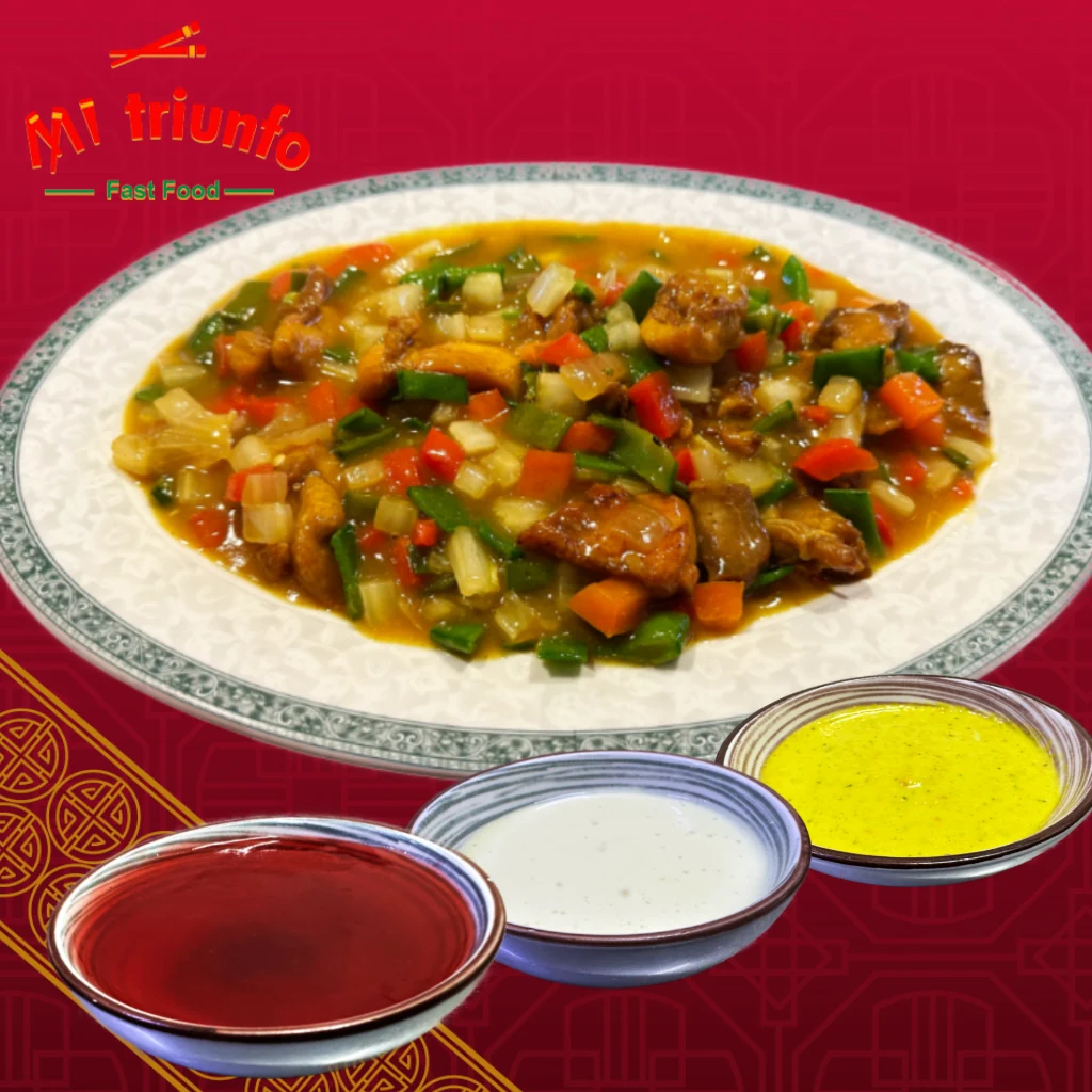 POLLO CROCANTE ACOMPAÑADO DE VERDURAS CHINAS Y UNA SALSA CURRY PICANTE