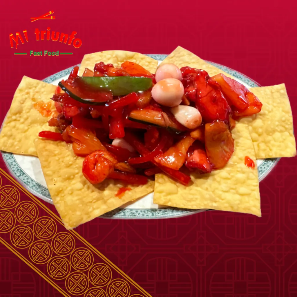 6 WANTANES FRITOS Y CROCANTES, ACOMPAÑADO DE UNA SALSA DE TAMARINDO , VERDURAS ENCURTIDAS, NABO, PIÑA, POLLO, CHANCHO, LANGOSTINOS